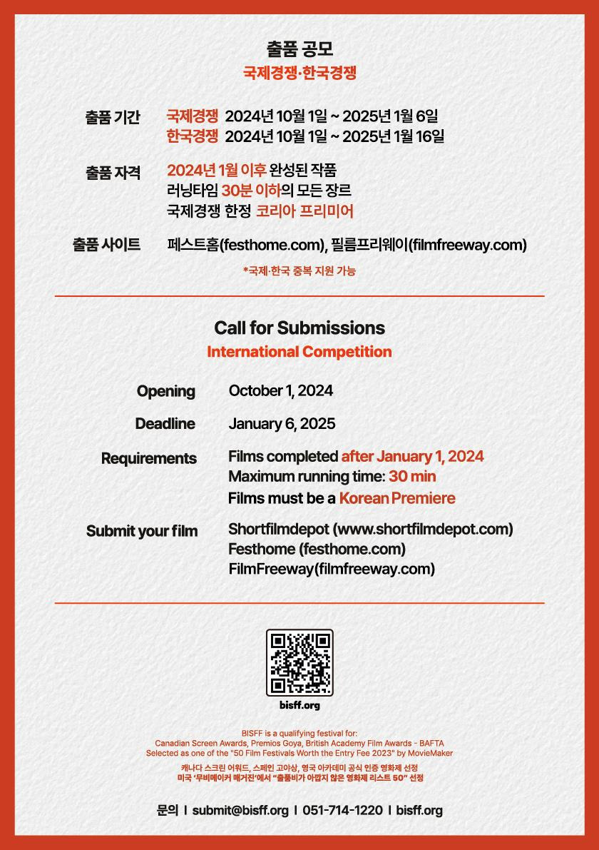 경쟁 부문 최종 선정작은 2025년 3월 12일에 발표됩니다. 이 발표는 부산국제단편영화제 공식 홈페이지를 통해 공개되며, 이후 상영 일정과 함께 공식적으로 공지될 예정입니다.